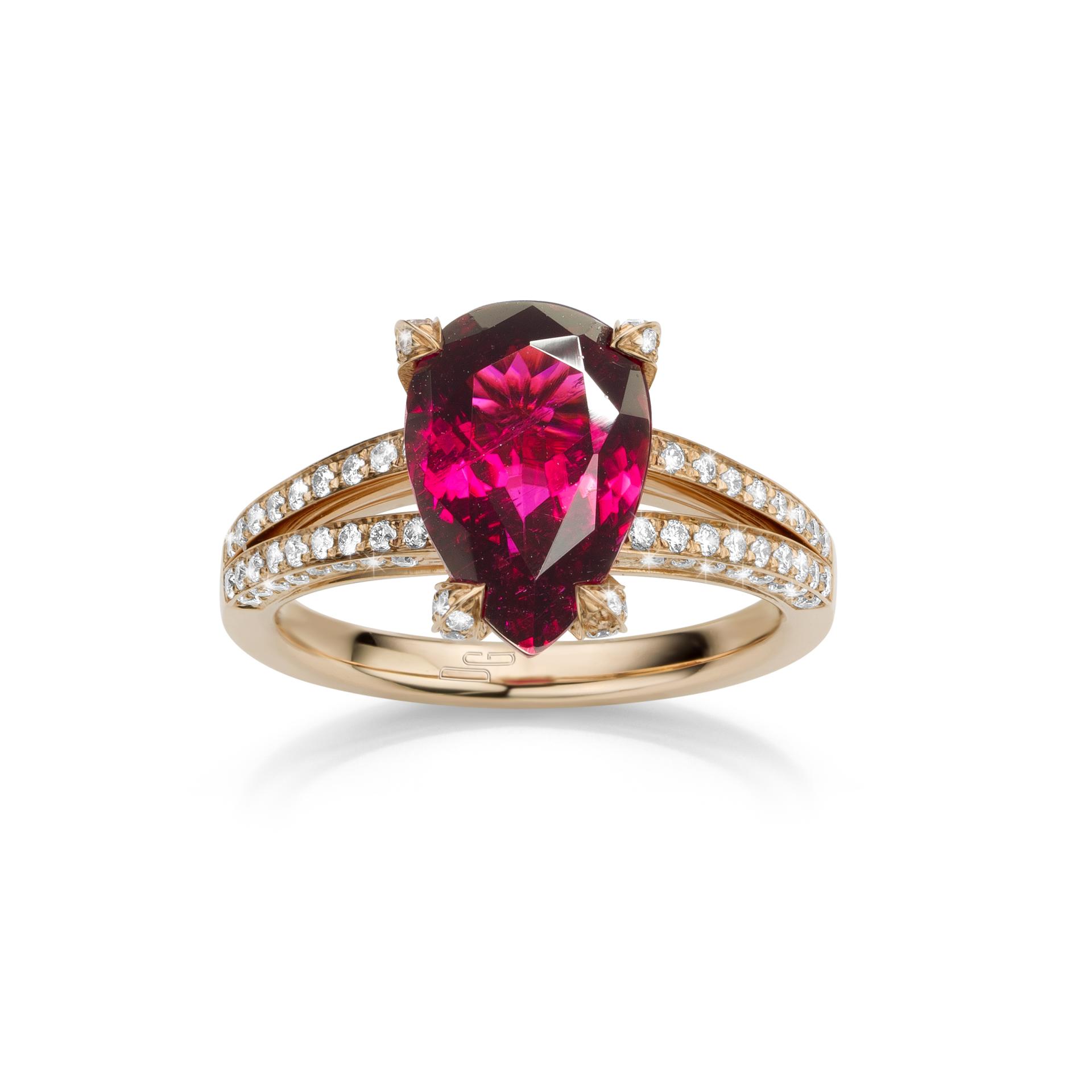 Rose gold ring set with a pear shaped rubellite and brilliant cut diamonds made by Atelier Wittmann