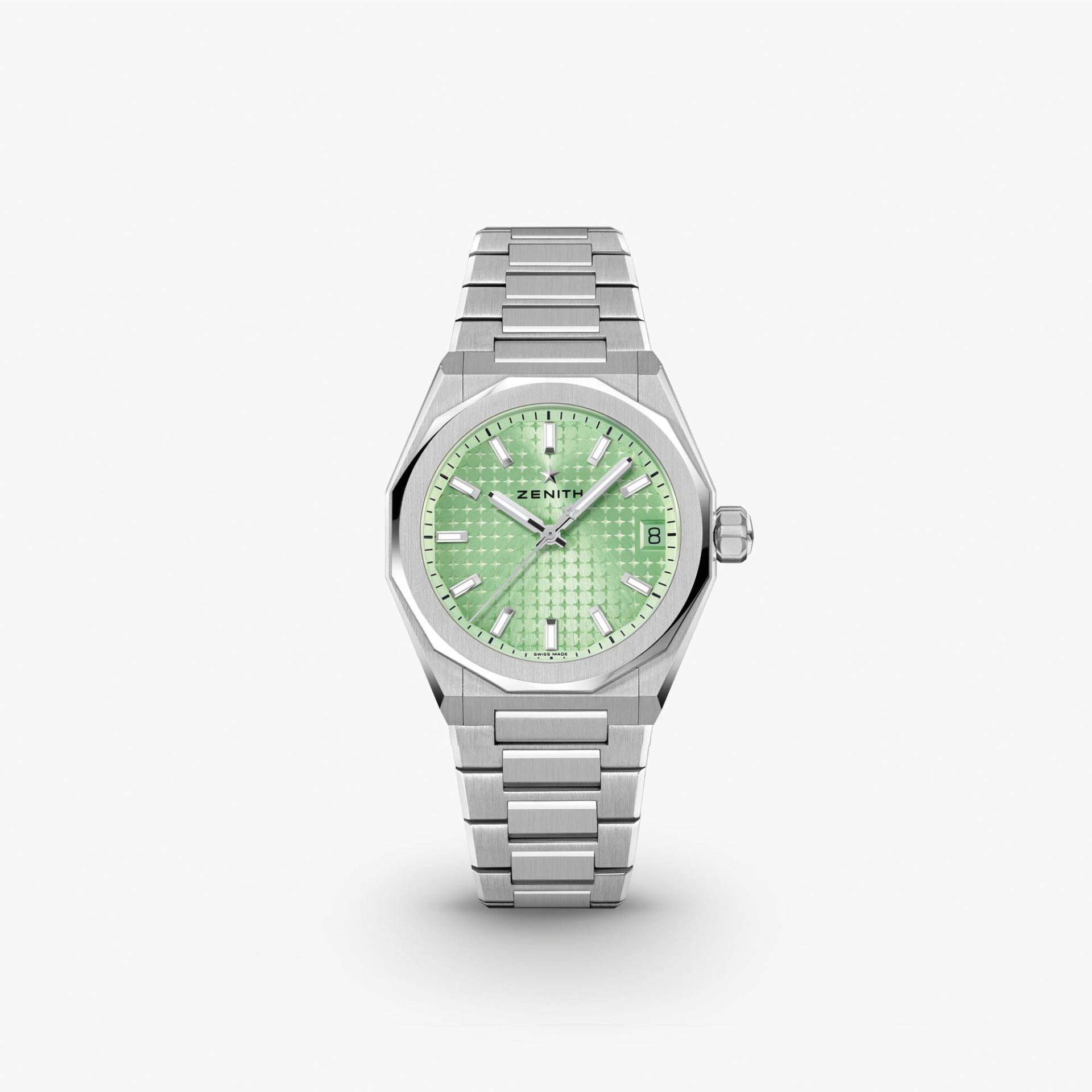 Wijzerplaat: gemetalliseerd pastelgroen met zonnig motief